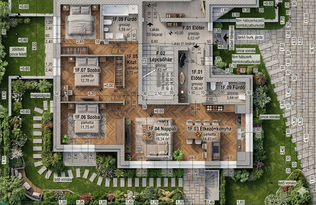 A ház körül jól használható, pihenésre és kikapcsolódásra alkalmas kertrészek jönnek létre, melyekhez a földszinti lakóterek, különösen a nappali, nagy méretű nyílászárókkal közvetlenül kapcsolódnak. A kert a tervezett koncepció alapján, parkosított jelleggel, változatos növényzettel, gyepfelülettel és a növények optimális vízellátását biztosító öntözőrendszerrel lesz kialakítva.