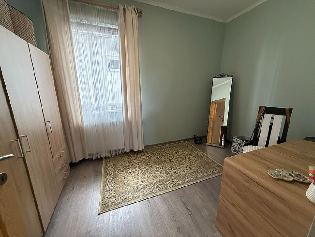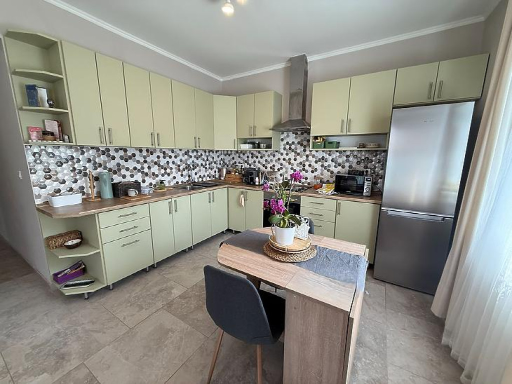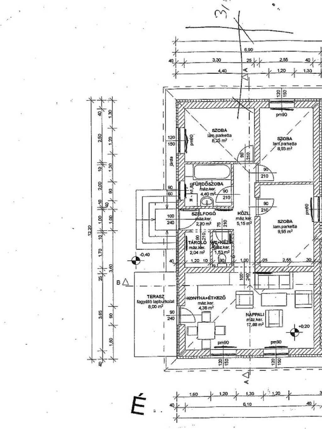 Amerikai konyhás nappali + étkező 8 négyzetméteres teraszkapcsolattal, 3 szoba, kádas fürdőszoba, wc, közlekedő, előszoba.