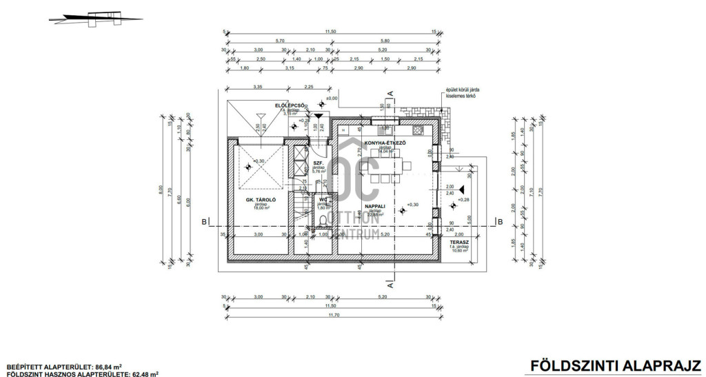 Földszint helyiségei : konyha - étkező - nappali, + terasz + garázs