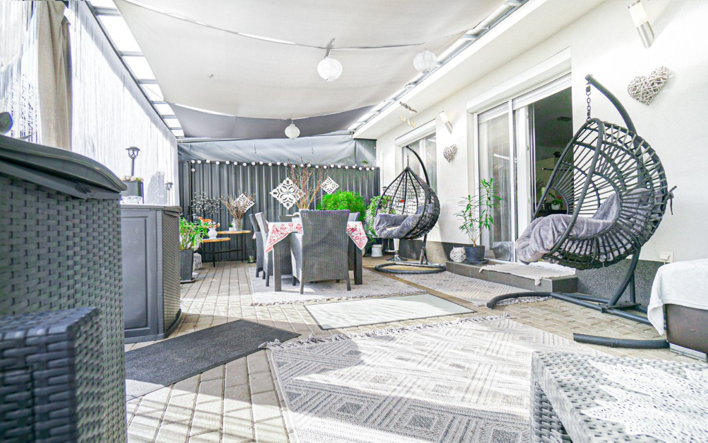 - 32 m2-es télikert, amely teljesen kinyitható, ekkor fedett teraszként funkcionál