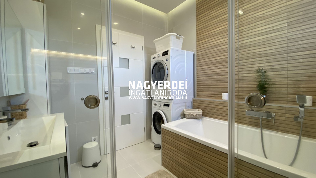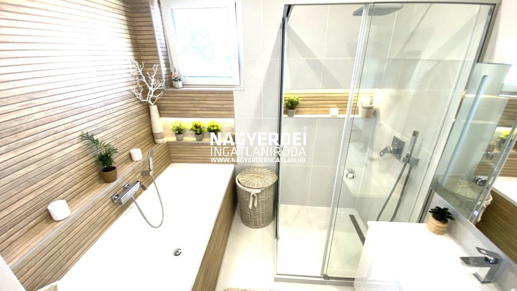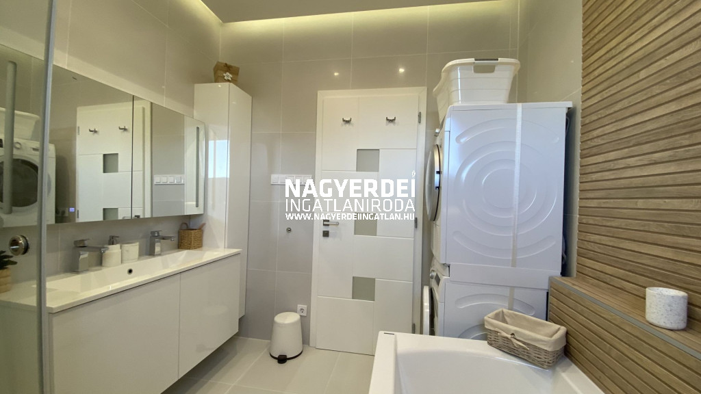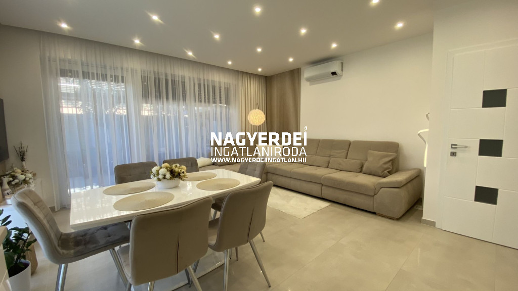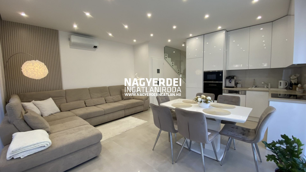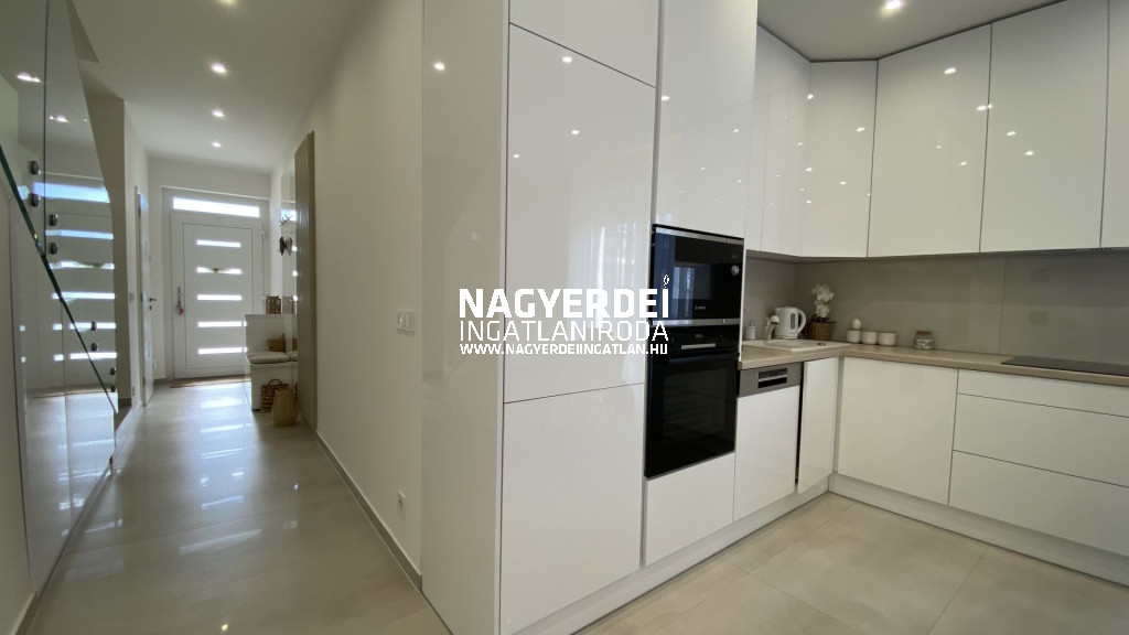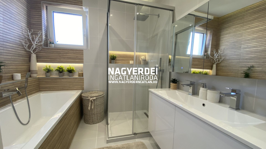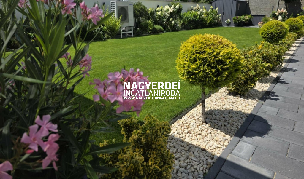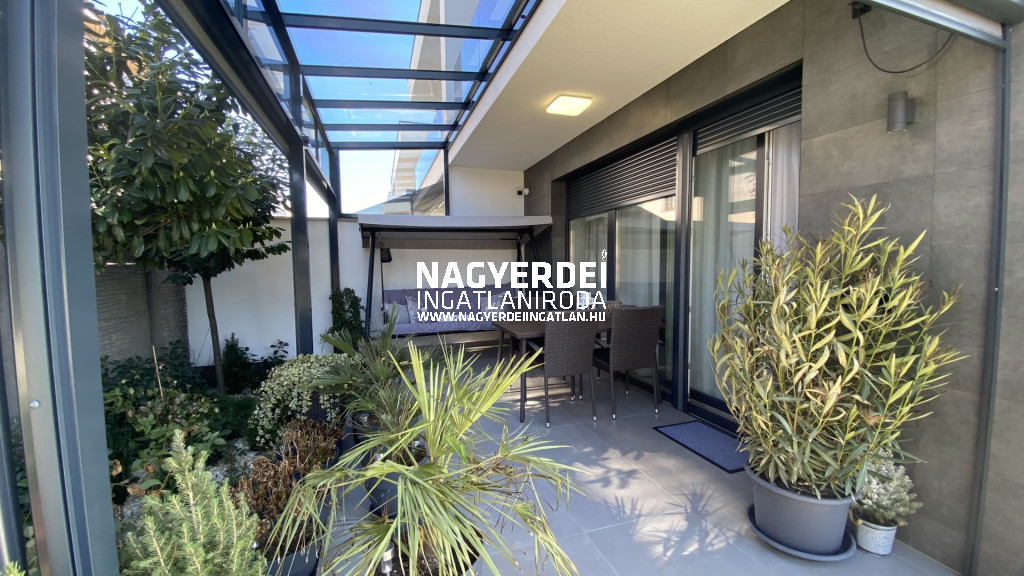 In the Nyulas district of Debrecen, a 117 m², LUXURY SEMI-DETACHED HOUSE, with a garage, covered parking space, garden storage, WITH DEMANDING DESIGN and HIGH TECHNICAL CONTENT, on a 308 m2 BEAUTIFULLY landscaped plot FOR SALE.