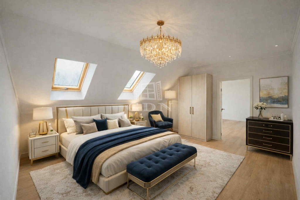 közlekedő-lépcsőtér 9,4 m2, 3 szoba (19,33 m2, 11,22 m2, 9,20 m2), fürdőszoba (7,25 m2), WC (1,53 m2), gardrób (5 m2).