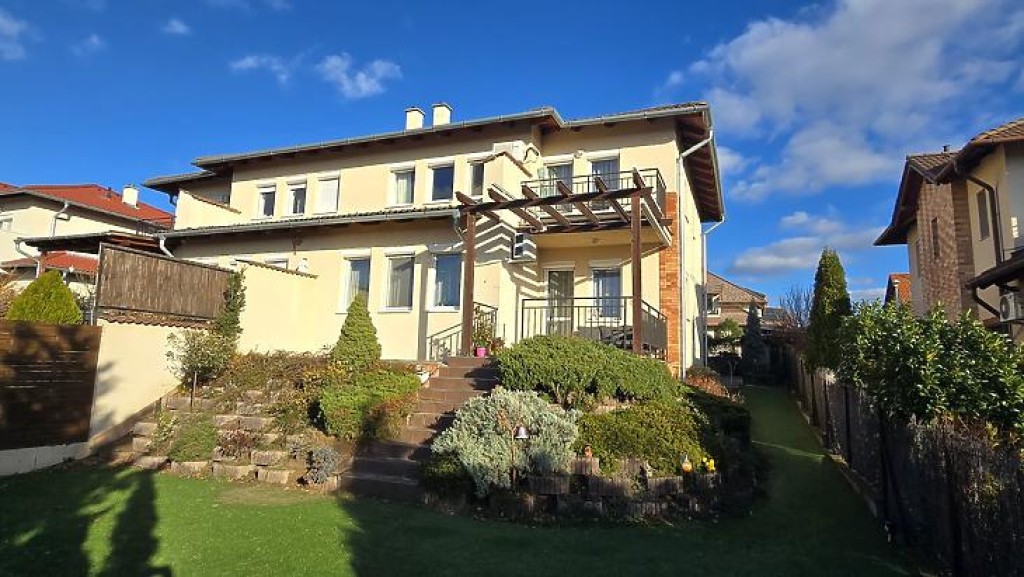 Eladásra kínálunk Dunakeszi közkedvelt részén, a Toldi lakóparkban egy bruttó 132 m²-es, kertkapcsolatos ikerházat, amelyből csodás panoráma nyílik a budai hegyekre.A földszinti rész tágas nappaliból + egy szobából, étkezős konyhából, fürdőszobából, spájzból, előszobából, valamint egy 16 m²-es garázsból áll. A konyhából megközelíthető terasz közvetlen kijárást biztosít a 352nm-es kertbe.