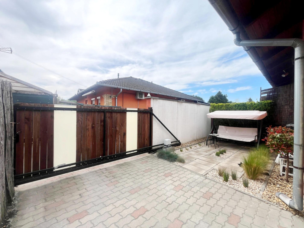 A 173 m²-es, rendezett telek kényelmes életteret biztosít, öntözőrendszerrel ellátott kerttel.