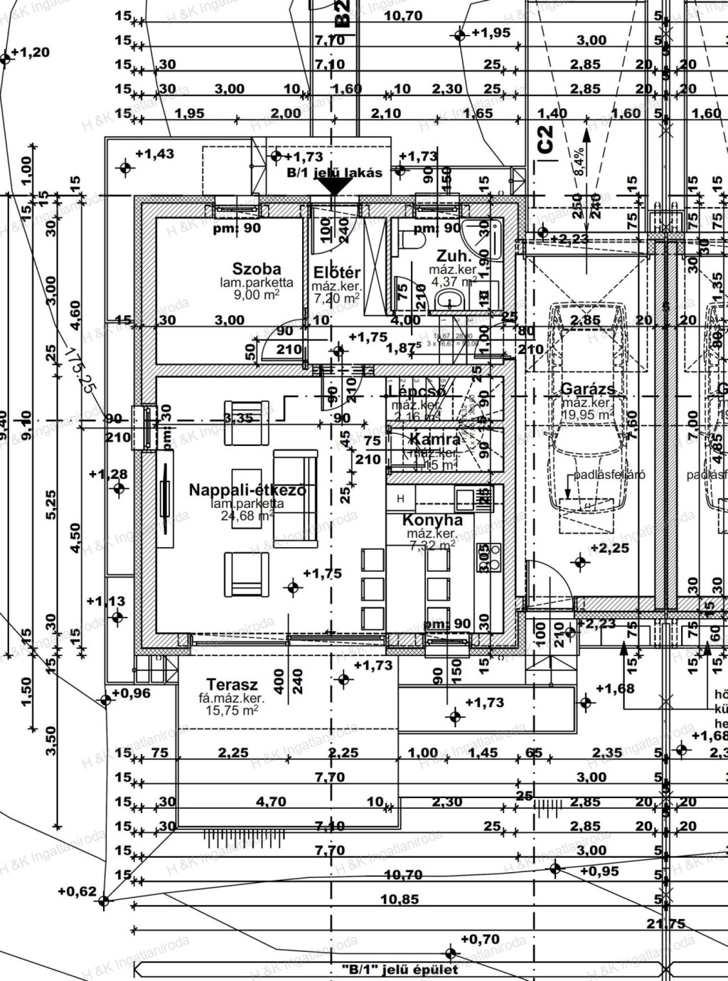 A földszint 75,83 nm a garázzsal + terasz: amerikai konyhás nappali + fürdőszoba zuhanyzóval + kamra + előtér + terasz
