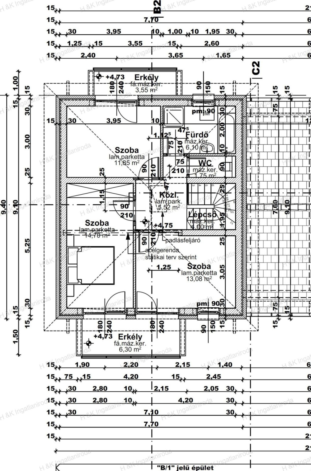 Az emelet 57 nm + 2 erkély: 3 hálószoba (mindegyik erkélykapcsolatos), fürdőszoba káddal, közlekedő