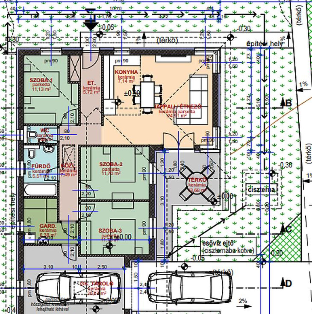 További extrák: 3 rétegű nyílászárók, biztonsági bejárati ajtó, elektromos garázskapu, klíma kiállások előkészítve.