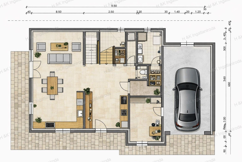 Nettó 160,13 nm (lakótér + garázs) + erkély és terasz, belső-kétszintes, amerikai-konyhás nappali + 4 szobás + gardrób, dupla komfortos, garázsos elrendezéssel.