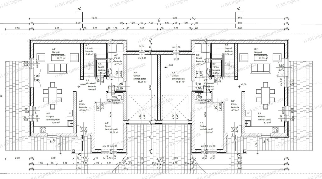 A ház 1488 nm-es telekre épül, a lakások belső kialakítása megegyezik.
