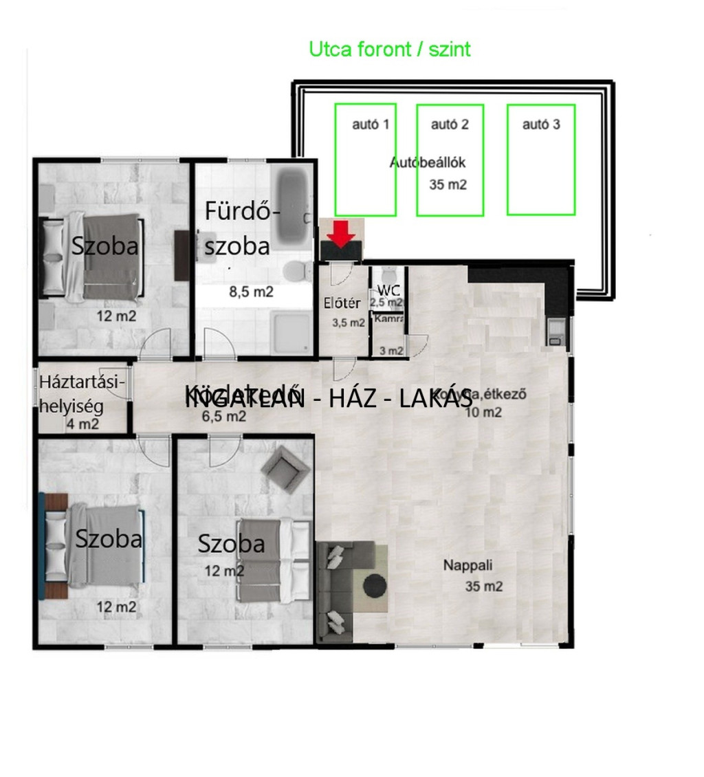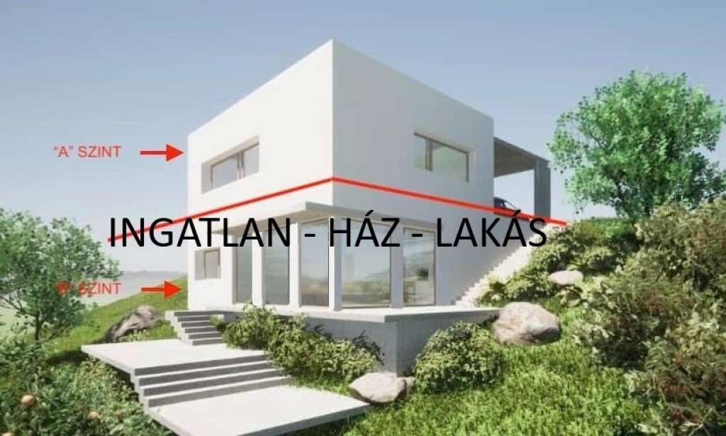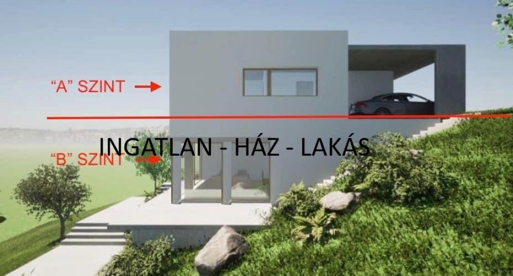 A leírásban szereplő ház szint a mellékelt képeken “A”-jelű szint eladásra kerül, annak nincs telekrésze az utcáról van a bejárata és a parkolás. Terasz kialakítása lehetséges.