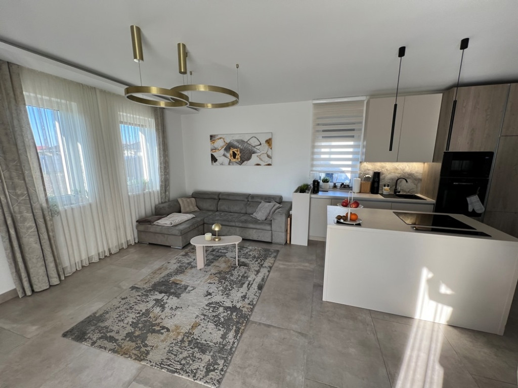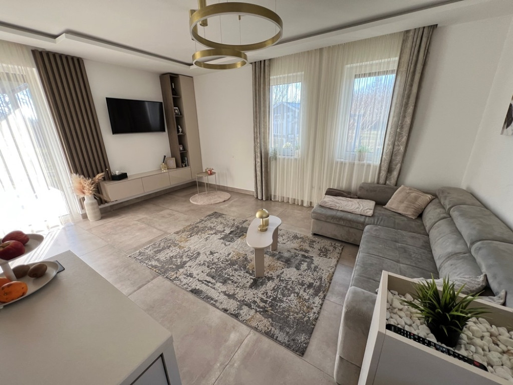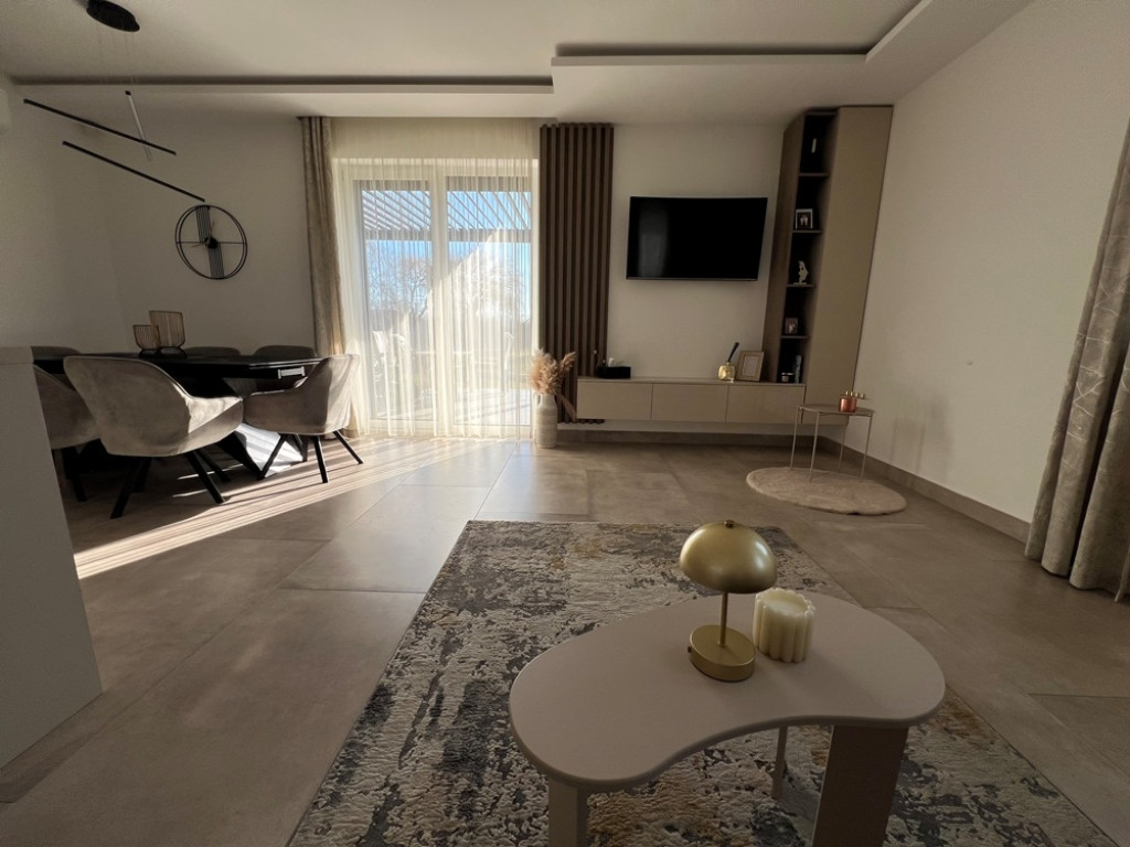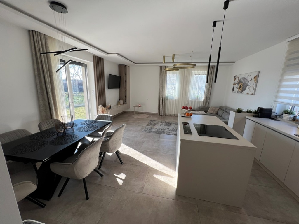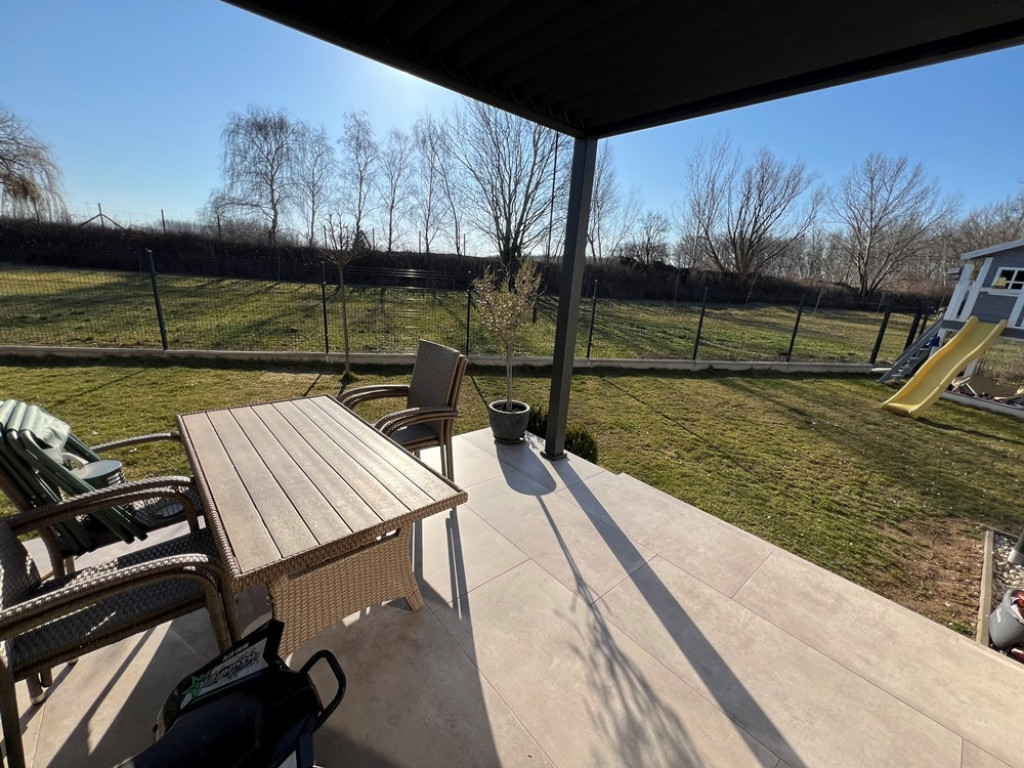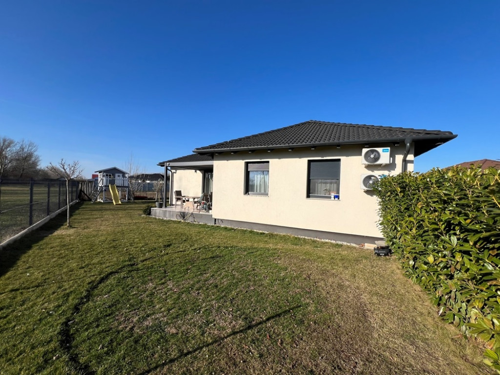 Győrzámoly csendes, szinte átmenőforgalom mentes, rendkívül kedvelt részén, újszerű családi házak környezetében, 851 m2-es összközműves telken, 504 m2-es telekhányadon, (saját, kizárólagos udvaron) lévő, amerikai konyha - étkező - nappali + 3 HÁLÓSZOBÁS, továbbá különálló fürdőszobával, különálló WC-vel, valamint háztartási helyiséggel/kamrával is felszerelt, 92 m2-es hasznos alapterületű, KLIMATIZÁLT, kiváló állapotú családi ház jellegű ikerház, 15,12 m2-es TERASSZAL, (alumínium lamellás pergolával) 2 db gépkocsi részére kialakított térkövezett beállóval eladó!Ár.: 118.750.000 Ft.