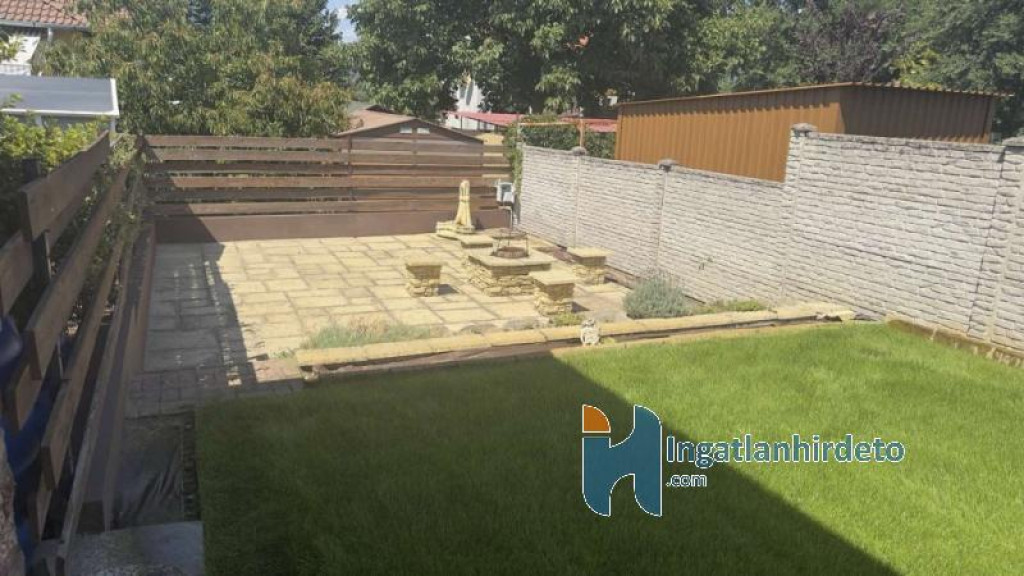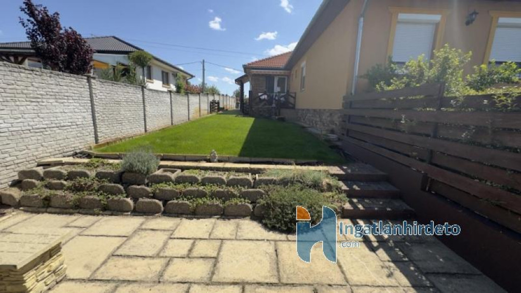A 16 m²-es garázs közvetlen kapcsolatban áll a lakótérrel, ami a mindennapokban kifejezetten kényelmes. Az udvar rendezett, automata öntözőrendszerrel kialakított, a kertben elkülönített főző- és bográcsozó hely található. Az előkert parkosított, a kerítés jó állapotú.