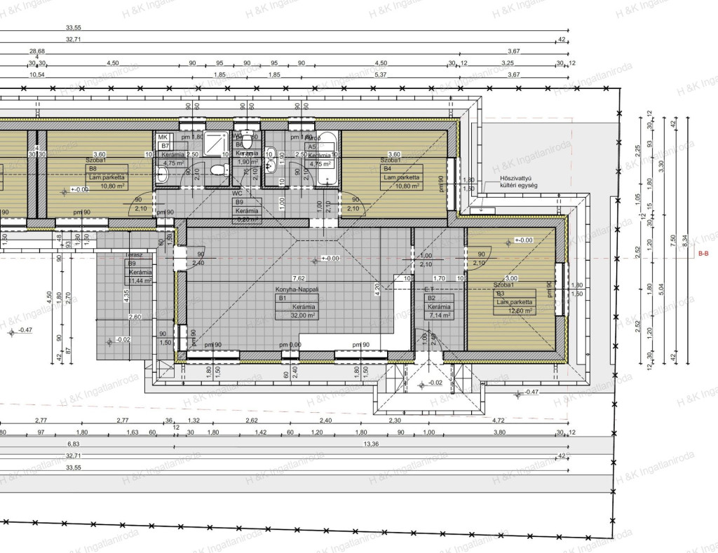 szélfogó 3 nm, előszoba 7,14 nm, nappali – konyha - étkező 32 nm, 3 szoba 10,8 - 11,31 - 12,6 nm, fürdőszoba 4,75 nm, háztartási helyiség 4,75 nm, közlekedő 6,5 nm, külön WC 1,9 nm, terasz 11,44 nm.
