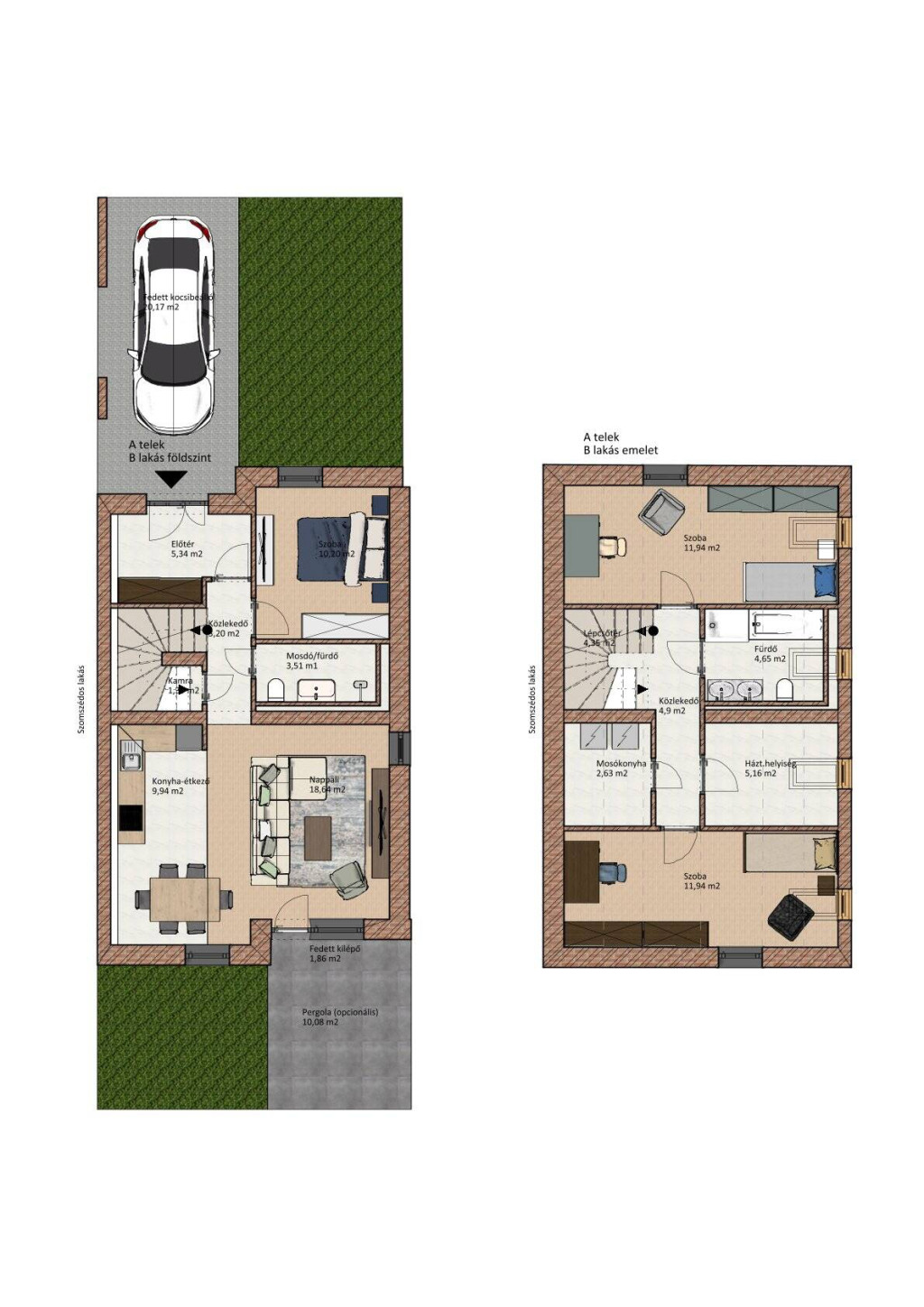 Opcionálisan fedett autóbeálló kérhető hozzá, melynek ára: 2,5M Ft.