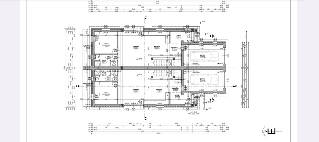 A földszinten: konyha-étkező-nappali (42m2), előtér, lépcsőház, 11,9m2-es szoba, zuhanyzó-wc-vel, L alakú nyitott terasz és egy burkolt 20m2-es garázs található.