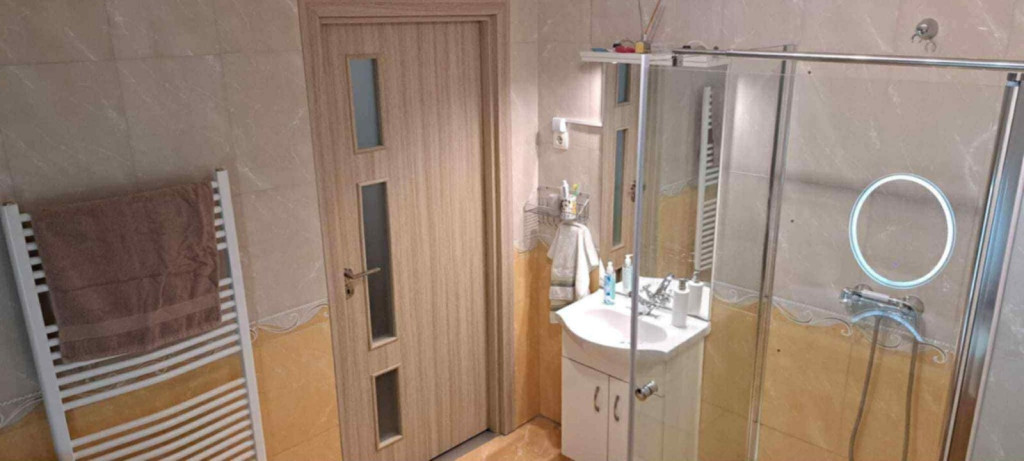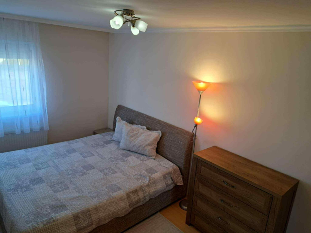 Alsó szint: nappali, konyha, kamra, 1 szoba, fürdőszoba sarokkáddal, külön WC.Felső szint: nappali, 2 szoba, gardróbszoba, zuhanyzós fürdőszoba WC-vel.
