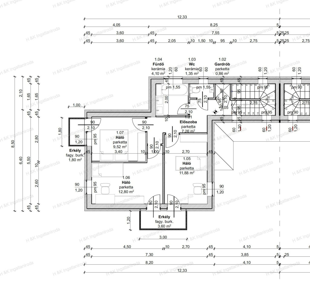 Emelet: 3 szoba 12,8 – 11,88 és 9,52 nm, fürdőszoba 4,1 nm, gardrób 0,86 nm, közlekedő 7,26 nm, külön WC 1,35 nm, 2 erkély 3,6 nm és 1,8 nm.