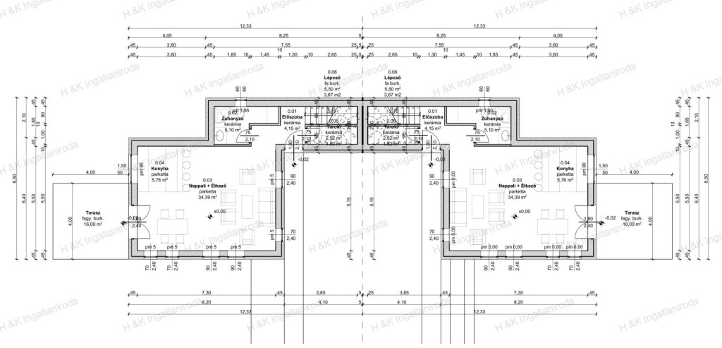 Földszint: amerikai konyhás nappali 40,15 nm, kapcsolódó terasz 16 nm, előszoba 4,15 nm, zuhanyzó 5,1 nm, tároló 2,52 nm, lépcső 5,5 nm.