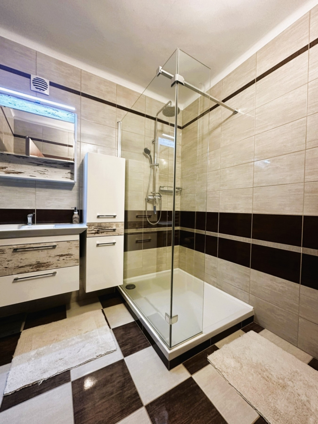 Két fürdőszoba (egy zuhanyzós és egy kádas) szolgálja a kényelmet, külön WC-kkel mindkét lakószinten.