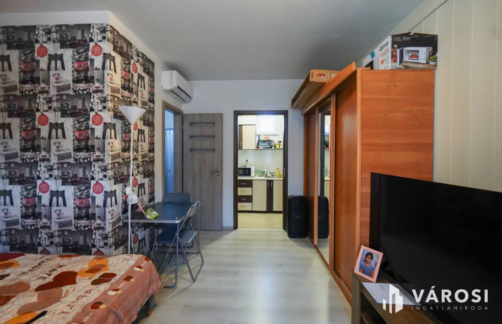 C., A harmadik lakás egy 27nm-es minigarzon, szoba, konyha, zuhanyzós fürdő mosdóval.