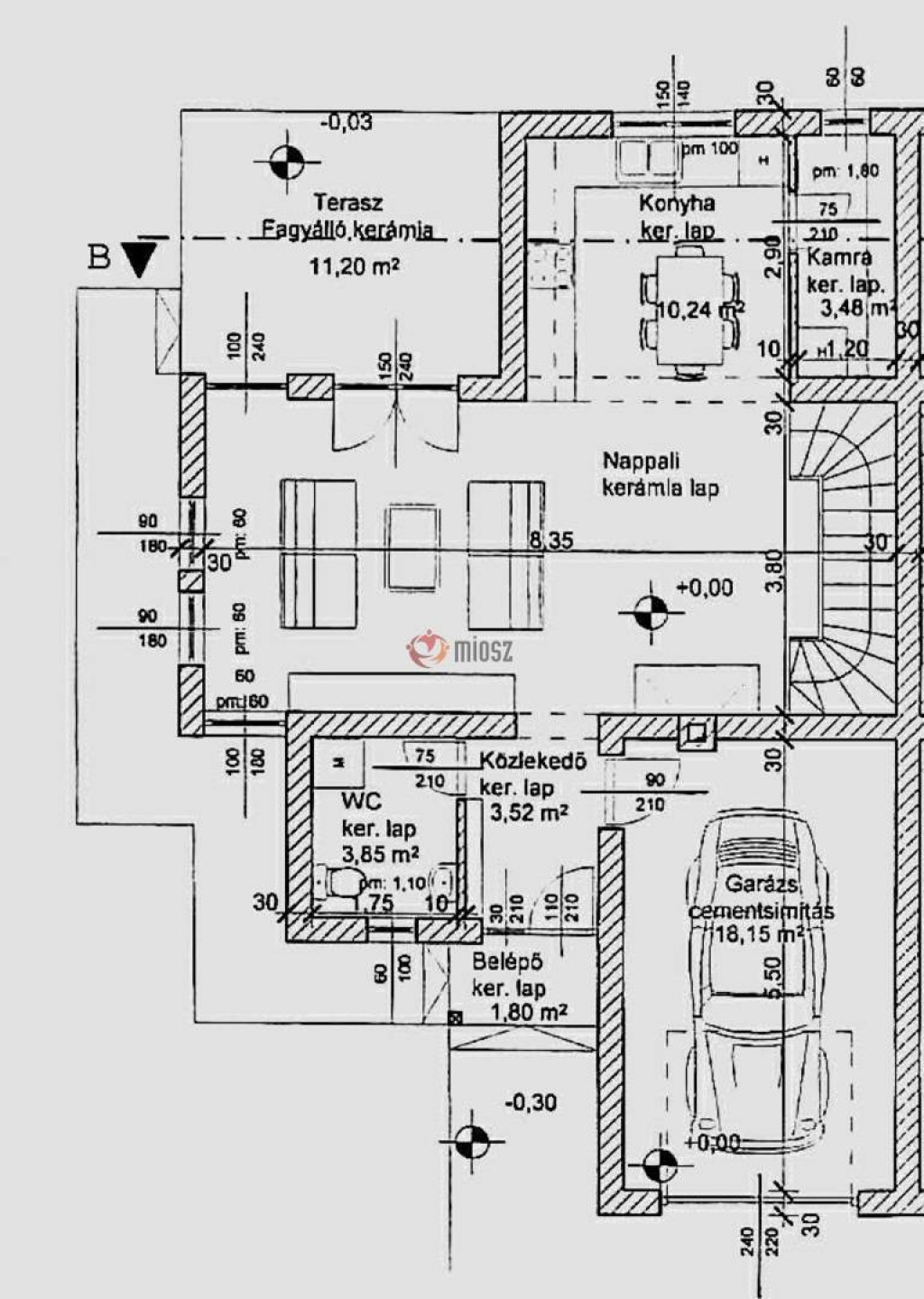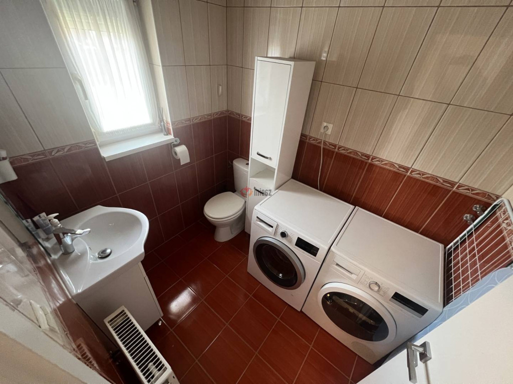 Ezen a szinten egy praktikus mosókonyha WC-vel is helyet kapott, ami nagy segítség a mindennapok során. A ház aljában található egy egyállásos garázs, ami külön kényelmet jelent, ráadásul innen közvetlenül az előszobába lehet bejutni, ami esős vagy hideg időben kifejezetten előnyös.