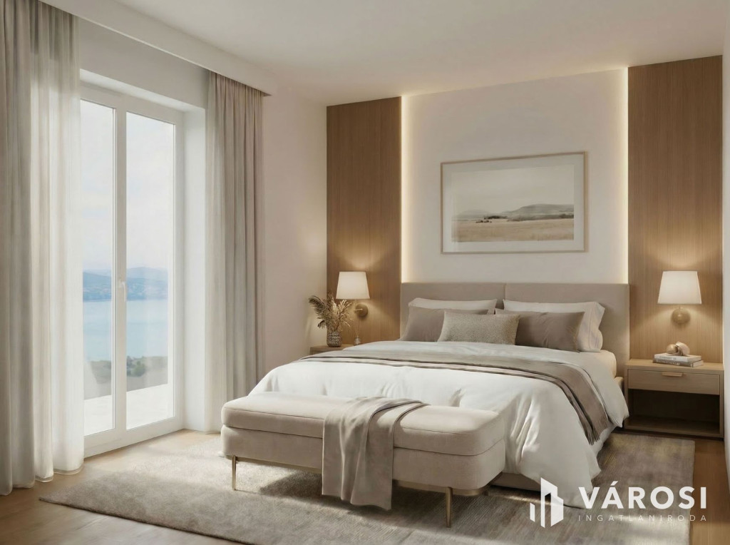 Eladó luxusingatlan Siófok legszebb lakóparkjában, panorámás kilátással a Balatonra!Siófok egyik legexkluzívabb, új építésű lakóparkjában kínálunk eladásra egy nettó 110 m2-es, prémium minőségű ikerházat, amelyhez ezen felül tartozik egy 24 m2-es terasz, egy 23,49 m2-es erkély és egy 37,16 m2-es tetőterasz. Az ingatlan tervezésénél rendkívüli figyelem lett fordítva a telek adottságainak maximális kihasználására, ezért a házból lenyűgöző, zavartalan panoráma nyílik a Balatonra, így minden nap a tó látványában gyönyörködhet!