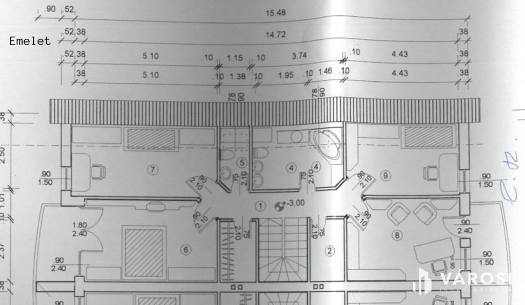 - Tetőtér: 4db nagy méretű hálószoba (16m2, 15m2, 13m2, 12m2) , nagy méretű fürdőszoba (9,5 m2) sarokkáddal, 2 erkély