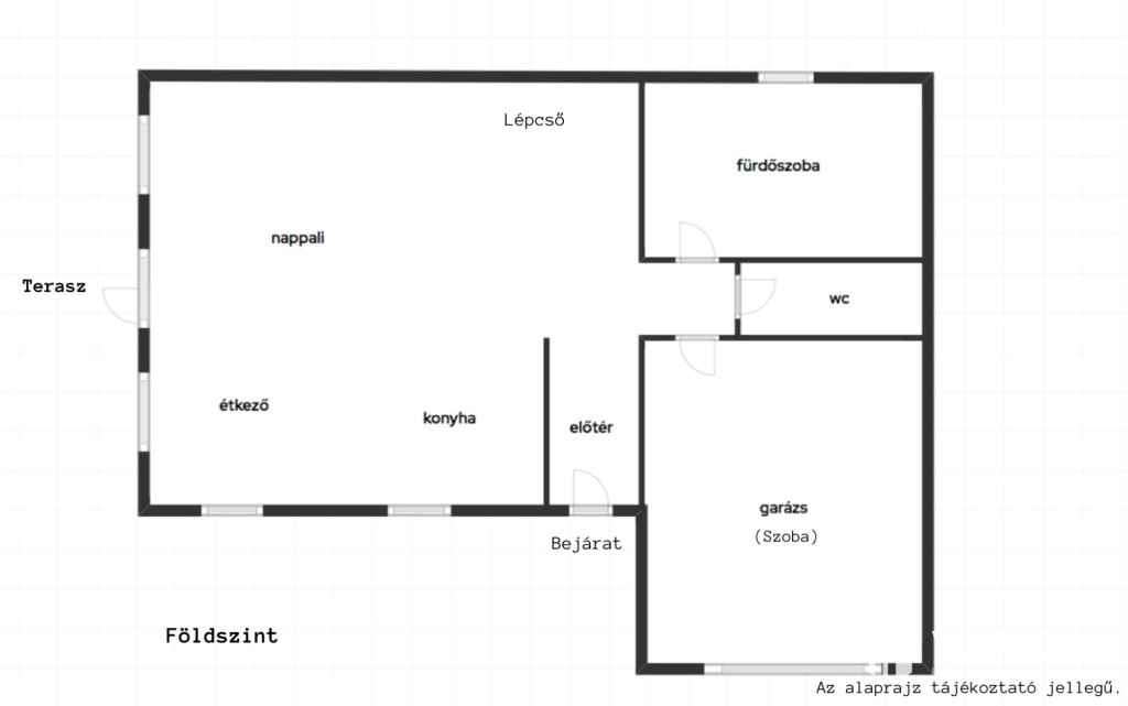 - Földszint: amerikai-konyhás nappali, előszoba, fürdő, wc, garázs