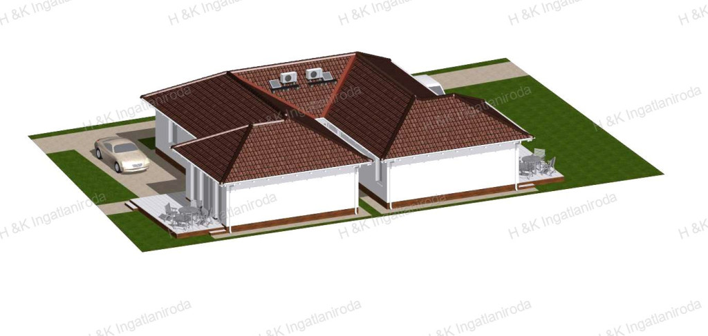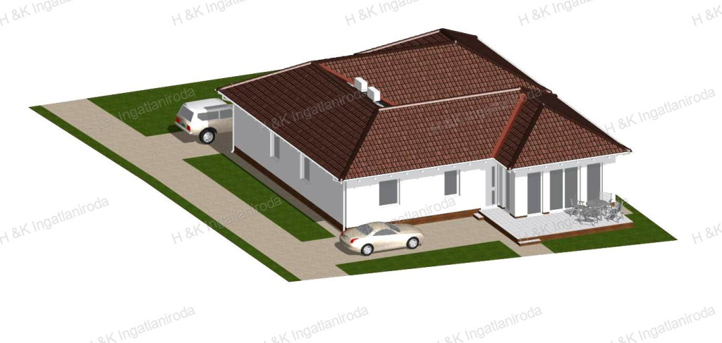 A tető barna színű, nagy-szilárdságú, anyagában színezett betoncserép fedést kap.