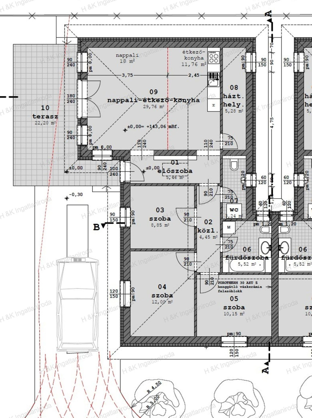 A ház falai 30-as Porotherm téglából épülnek, 15 cm-es külső szigeteléssel, betonfödémmel.