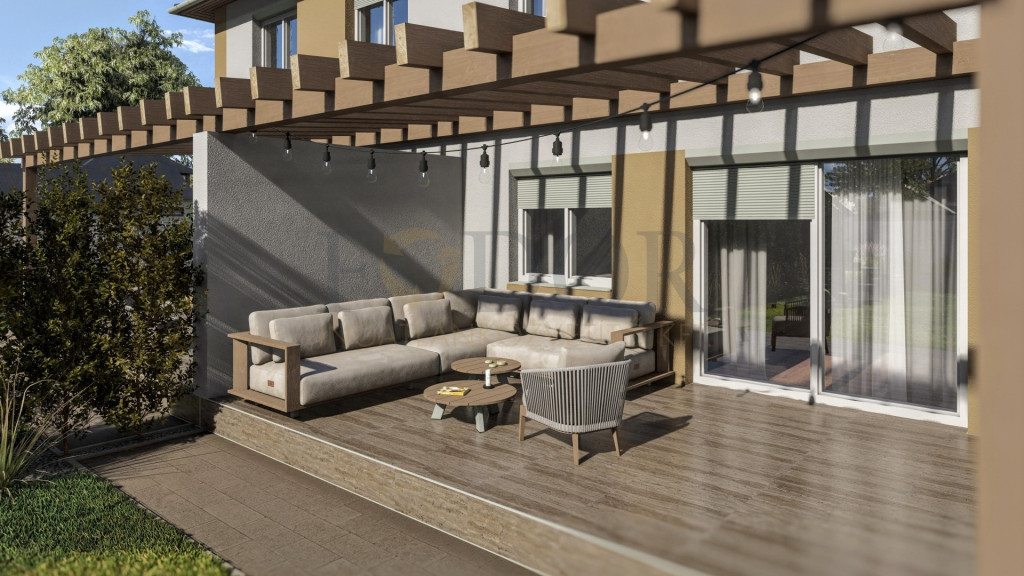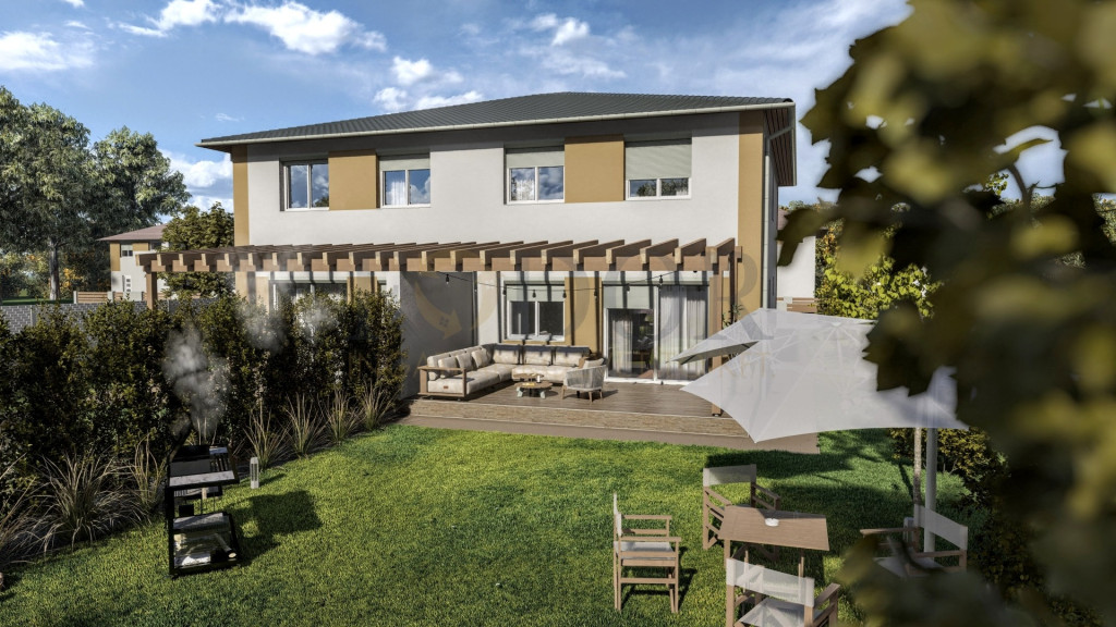 A 849 m²-es telken épülő ingatlan mindkét fele saját, 424 m²-es leválasztott telekrésszel rendelkezik, valamint egy viacolorral burkolt kocsibeállóval is ellátott.