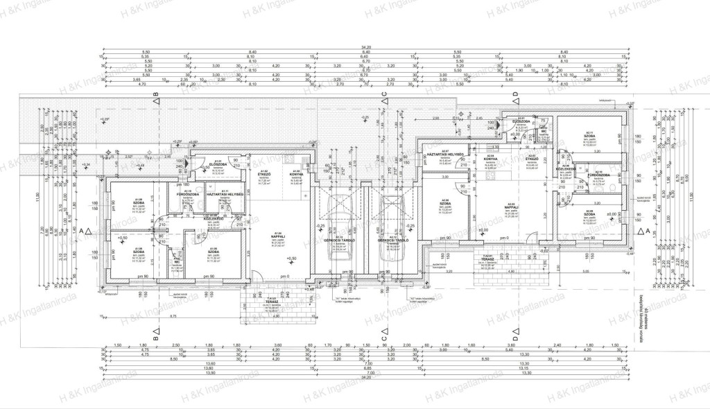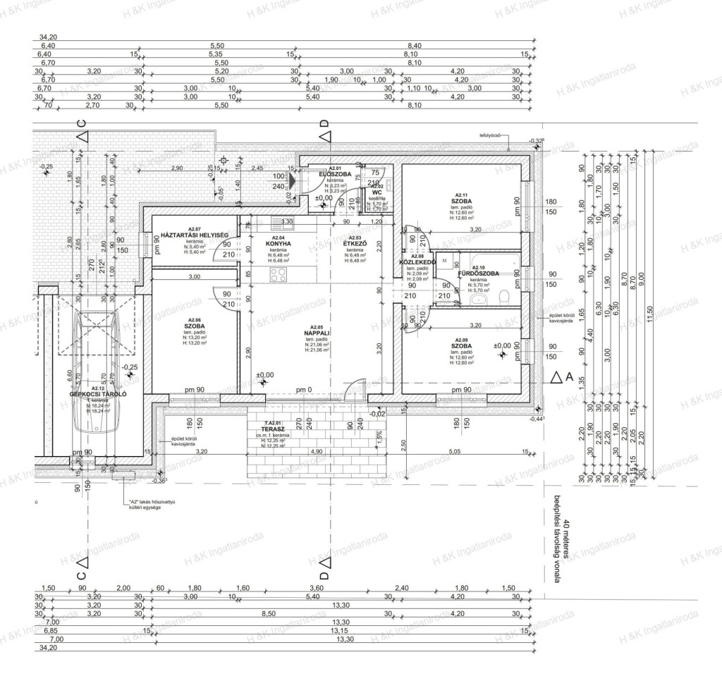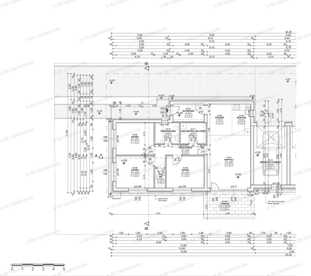 Előtér 5,1 nm, nappali 21,42 nm, konyha 5,4 nm, étkező 7,2 nm, 3 szoba 11,32 – 11,31 – 11,32 nm, fürdőszoba 4,7 nm, külön WC 1,9 nm, háztartási helyiség 5 nm, közlekedő 6,15 nm, terasz 12,25 nm, garázs 18,24 nm.