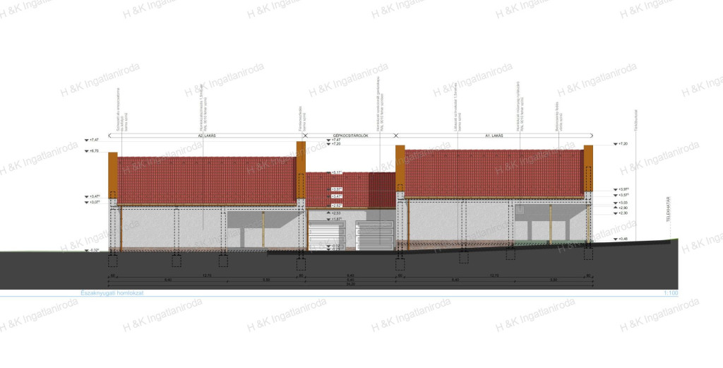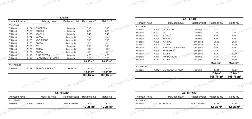 Az 1-es lakás (utcafronti) bruttó 116 nm, nettó lakótér 90,83 nm + 18,24 nm garázs + 12,25 nm terasz, amerikai-konyhás nappali + 3 szobás, DUPLA KOMFORTOS, földszintes, kb. 500 nm-es telekrésszel.