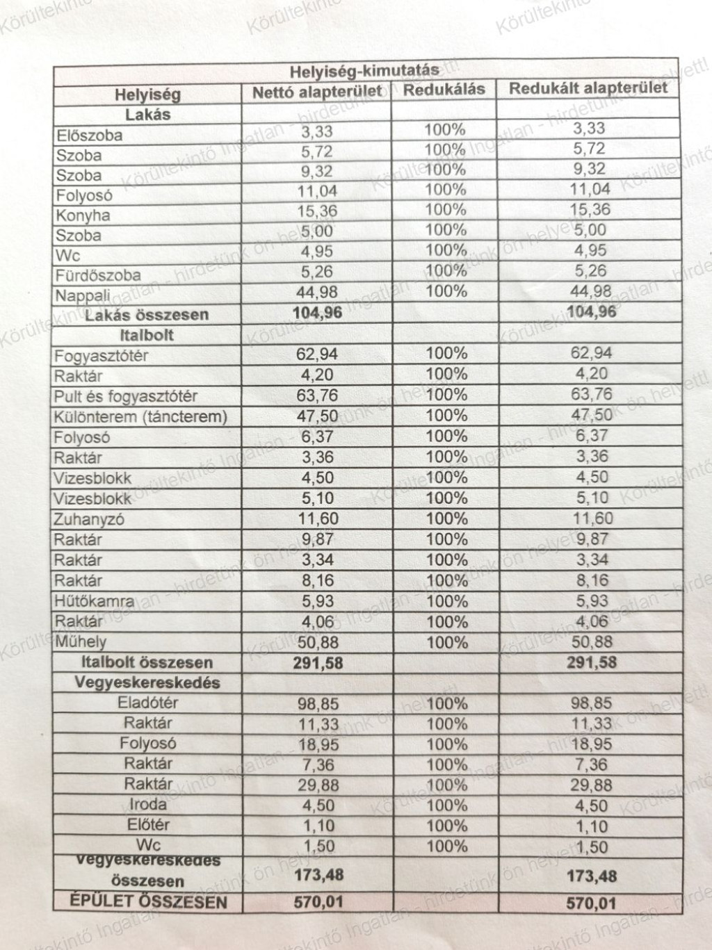 A mintegy 32 helyiségből álló épületkomplexumban a fő kereskedelmi- és vendéglátó-helyiségek mellett sok raktárhelyiség, illetve egy hűtőkamra is helyet kapott. Az ingatlan előtt, illetve a telken belül bőségesen van parkolóhely.