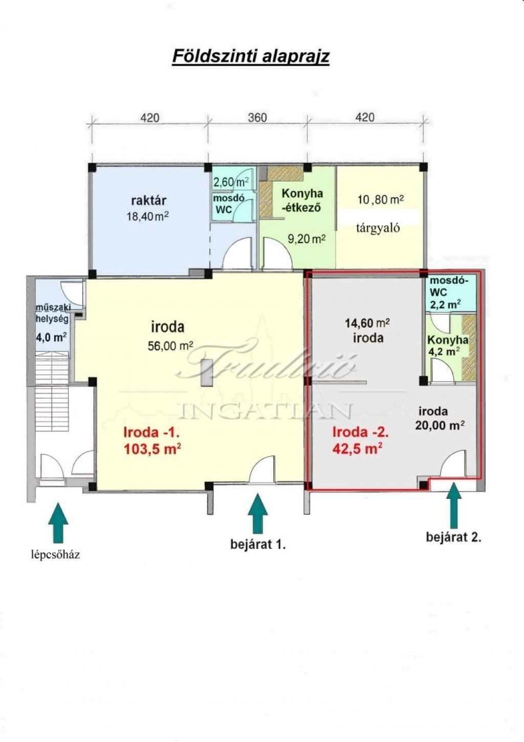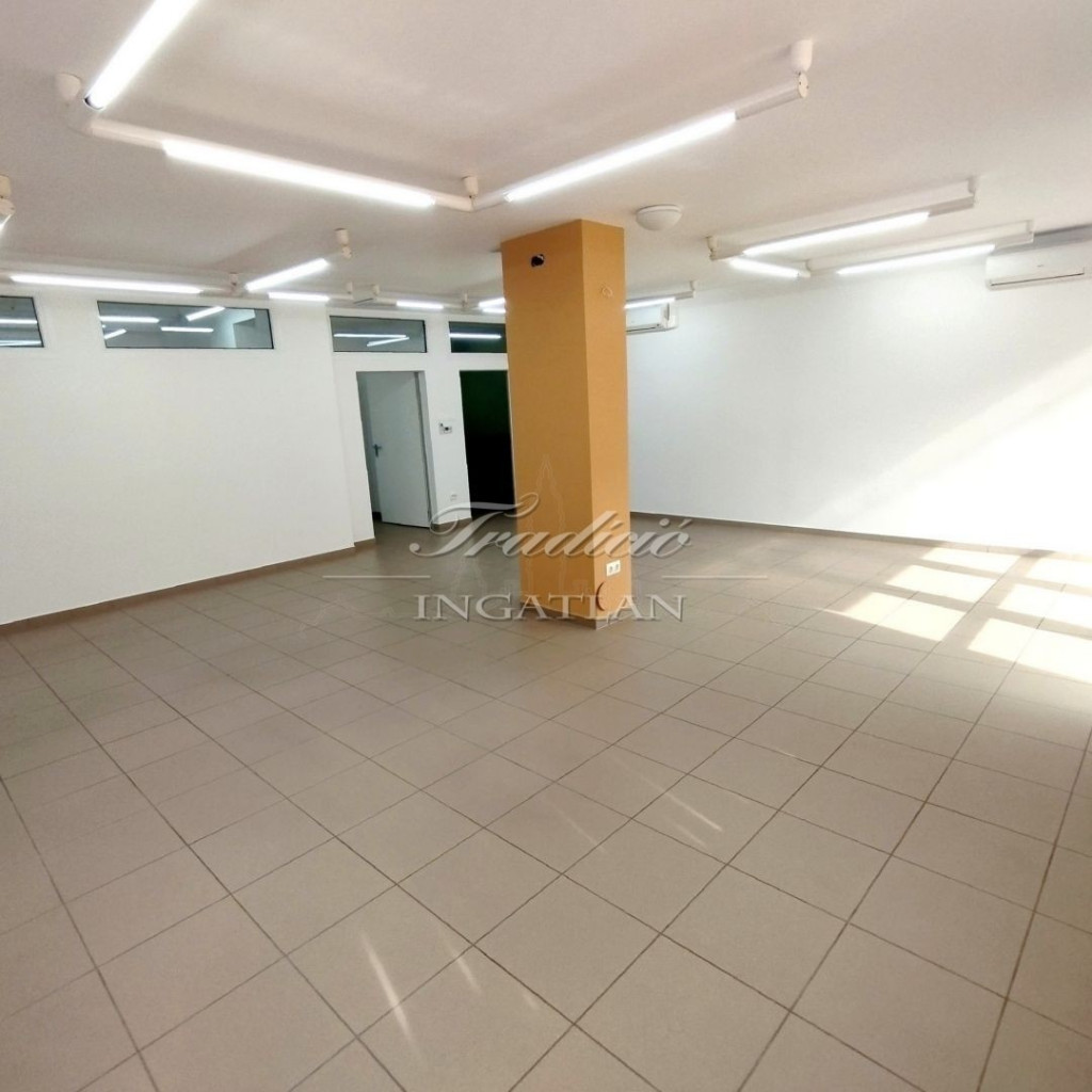 A 103,5 m2-es iroda elrendezése végett akár üzletnek, bemutatóteremnek is alkalmas lehet. A több helyiségből álló ingatlanban étkező-konyha, raktár, tárgyaló és vizesblokk is kialakításra került.