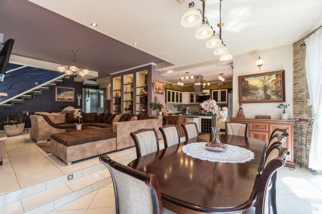 Die eleganten, klassischen Stilmerkmale, die das ganze Haus überspannen, kehren in jeden Zimmer, Korridoren und Räumen zurück. Die künstlerische Tapeten, das schmiedeeiserne Treppengeländer und die Echtholz-Möbelstücke machen alle Winkel der Immobilie individuell.