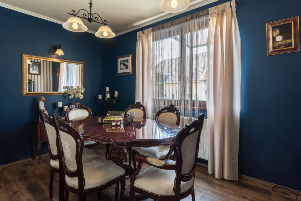 Az egész házat átívelő elegáns, klasszikus stílusjegyek valamennyi szobában, közlekedő térben és helyiségben visszaköszönnek. A műalkotás jellegű tapéták, kovácsoltvas lépcsőkorlát, és valódi fa lakberendezési elemek teszik egyedivé az ingatlan minden szegletét.