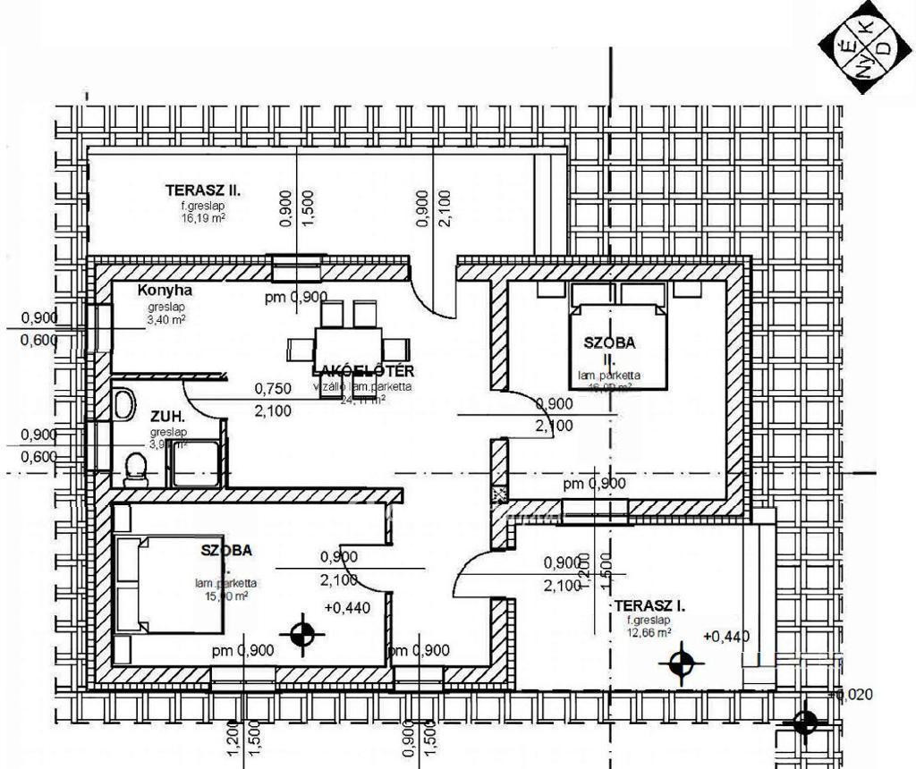Helyiségek: nappali-konyha-étkező, 2 szoba, zuhanyzós fürdő (WC-vel egyben), két terasz 28,85 m2.