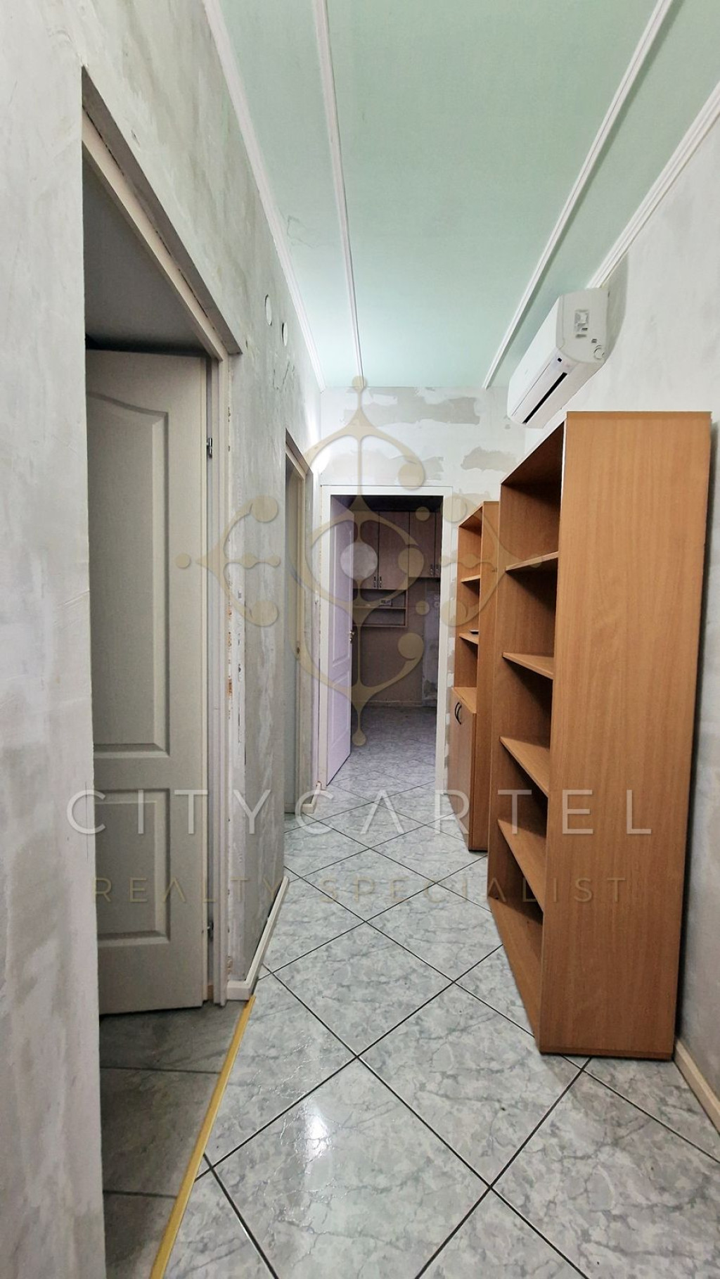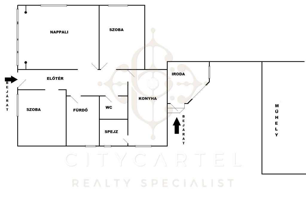 Az utca felől a földszinti lakás kis előkerttel rendelkezik, a műhely udvari részétől kerítéssel leválasztva. Bent hosszú közlekedő, amitől balra a nagy 22 nm-es nappali, mellette egy szoba, jobbra még egy szoba, zuhanyzós fürdő, külön WC, a konyhából pedig egy spejz is nyílik.