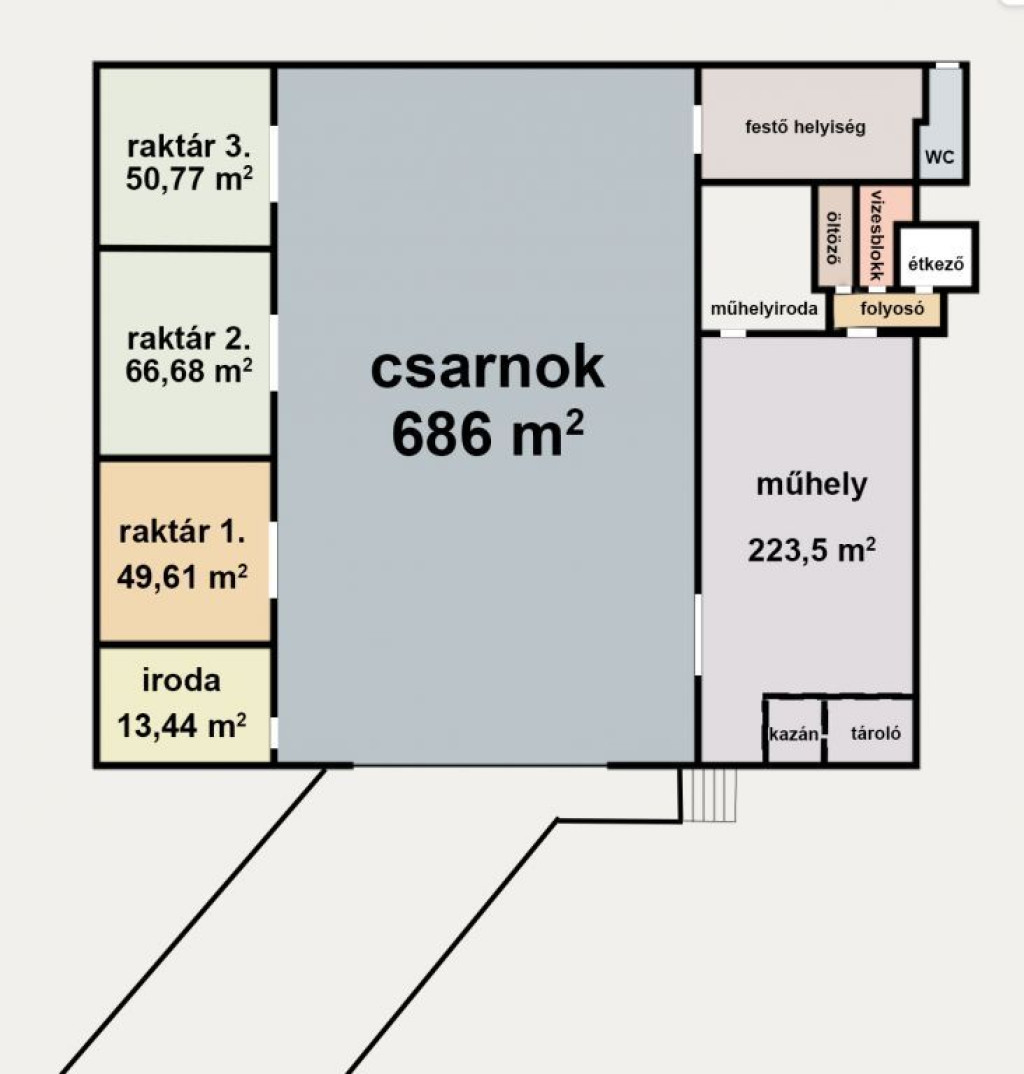 - gyártócsarnok: 686 m2,
