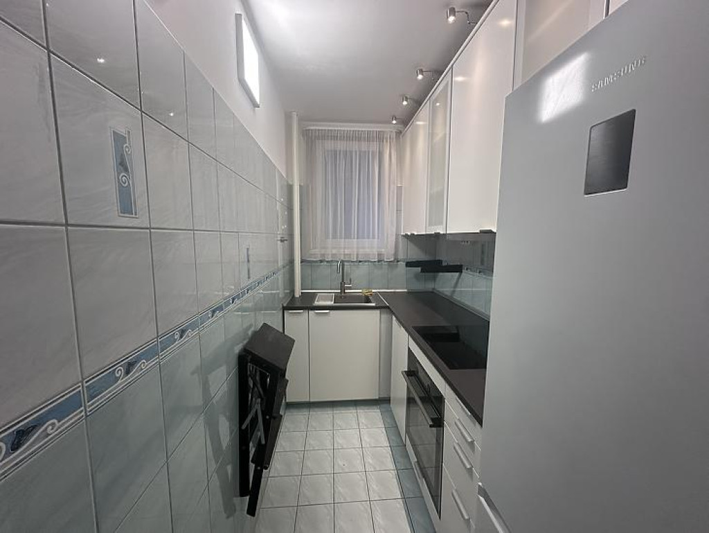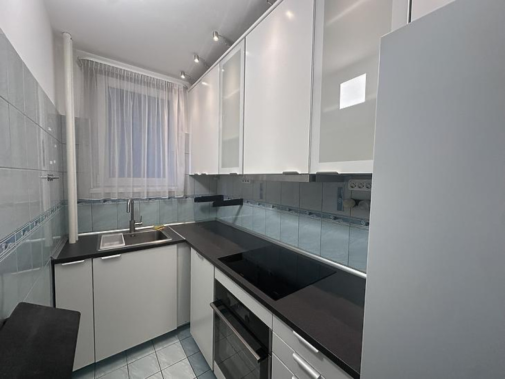 Konyhája ablakos, világos. A beépített bútorzat és a gépesítés a vételár részét képezi.