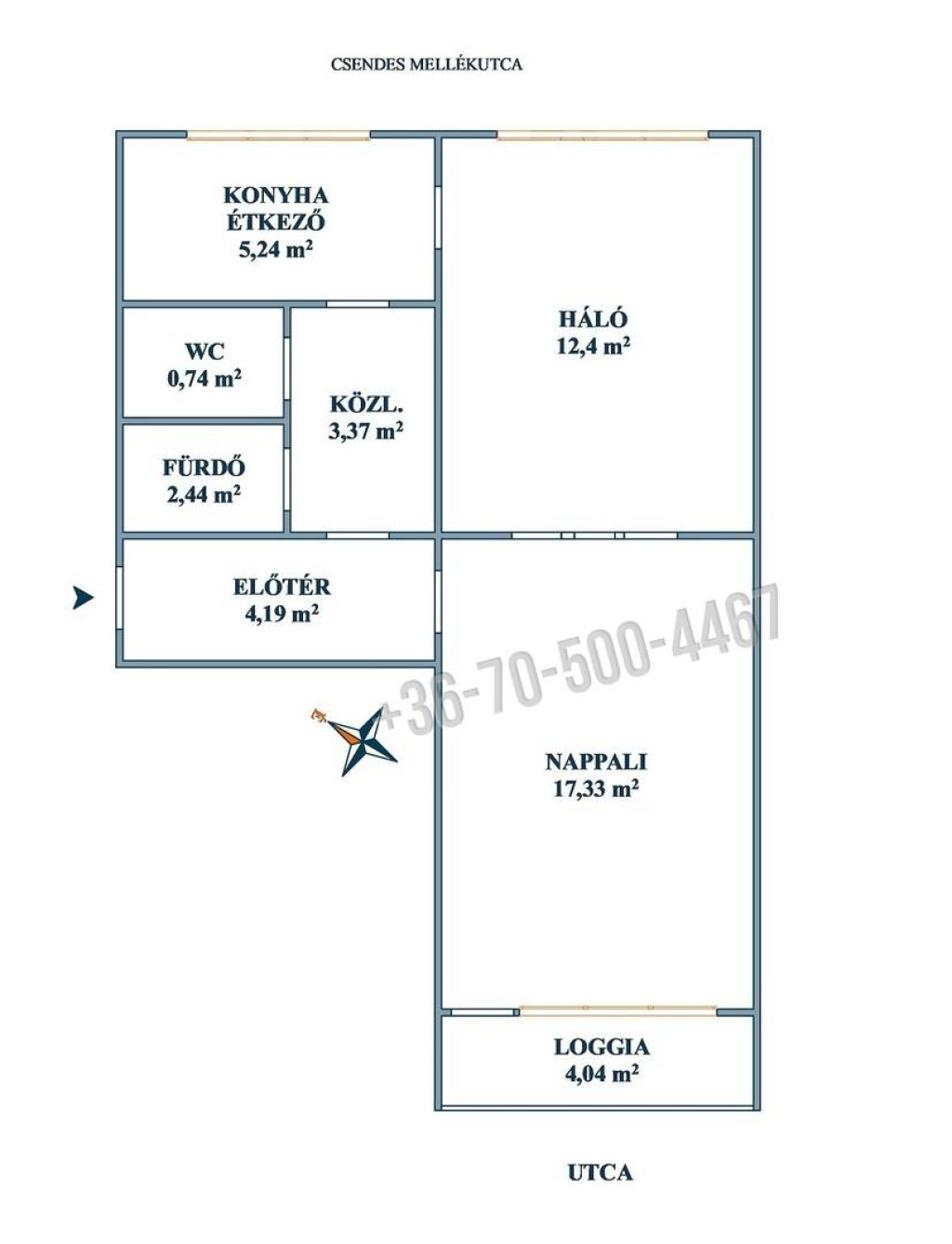 Bejáratán belépve egy előtér található, melyből a nappali, valamint egy közlekedő nyílik. A közlekedőből nyílik a külön álló káddal felszerelt fürdő, a mellékhelyiség, valamint az étkezős konyha. Innen nyílik a hálószoba, mely a nappalihoz kapcsolódik, mely megközelíthető az előtérből is. Nappalijához egy 4 nm-es loggia is kapcsolódik.