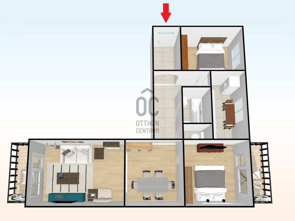 + Nappali + 2 hálószoba vár itt rád, ahol még egy étkező is ki lett alakítva a hallban.