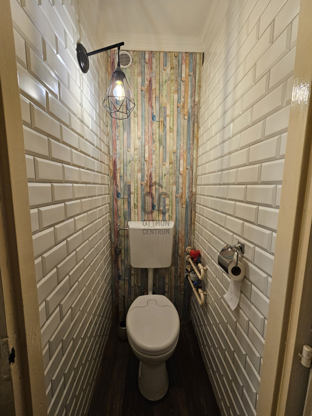 A konyha és az előszoba hidegburkolatos. A fürdőszoba, WC és kamra fa hatású PVC burkolattal rendelkezik, amely alatt csempe található. A fürdőszoba és a WC falát műanyag falpanel borítja.