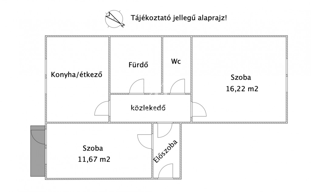 - 1 egész szobából, 1 félszobából, előszobából, konyhából/étkezőből, fürdőszobából, valamint WC-ből áll.