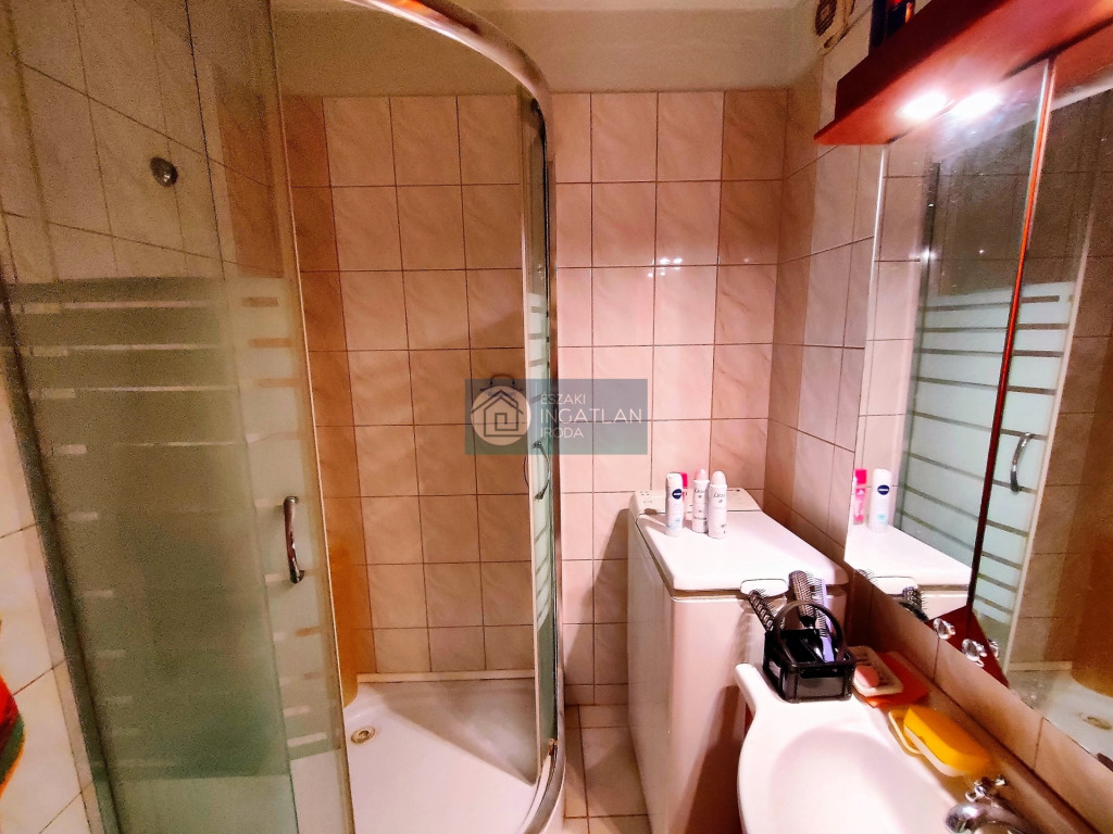 A felújított fürdőszobában zuhanykabin van.