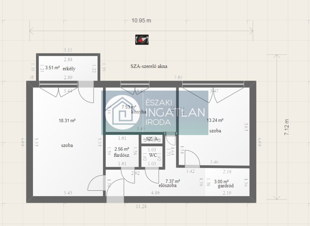 • 57 m², 2 külön nyíló szoba + gardró