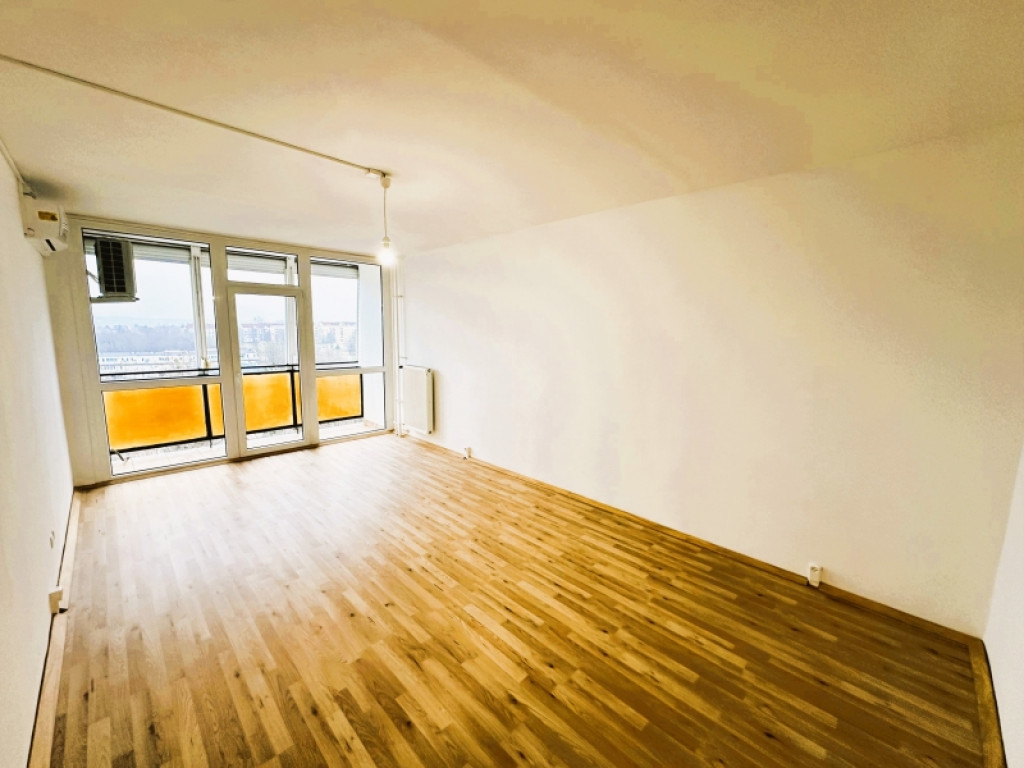 A nappaliból erkély nyílik, ahonnan szép, panorámás kilátás tárul a városra – a 8. emelet nyugalma és fénye érezhetően emeli az életteret.