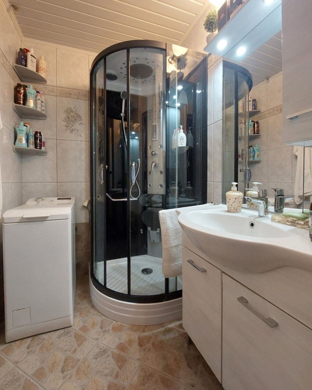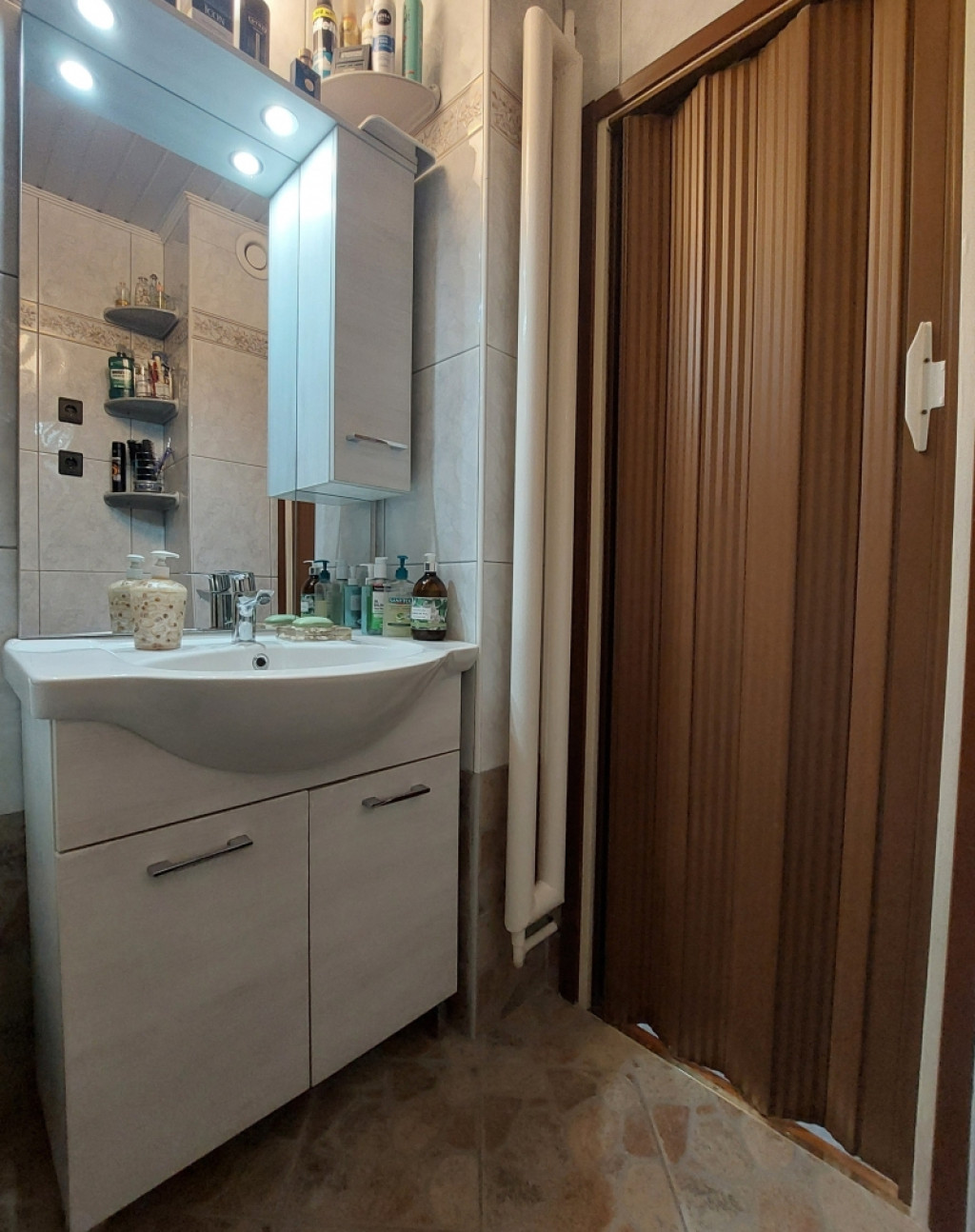 A konyhában egyedi, fa ajtós konyhabútor található, az előszobában beépített szekrények biztosítják a rendszerezett tárolást. A fürdőszoba zuhanykabinos, a WC külön helyiségben kapott helyet, ami kényelmes megoldást jelent a mindennapokban.
