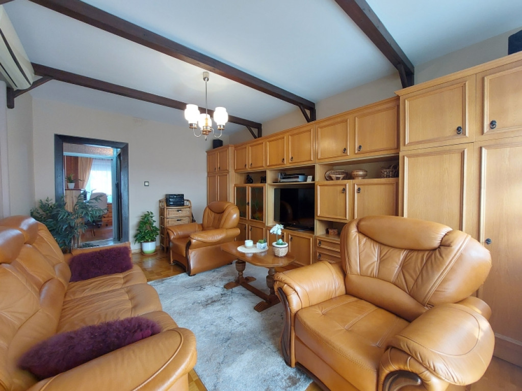 Az előszobában, a konyhában és az egyik szobában fa lambéria, a nappaliban és a konyhában pedig fa díszgerendák találhatók, amelyek meleg, karakteres hangulatot kölcsönöznek a lakásnak.